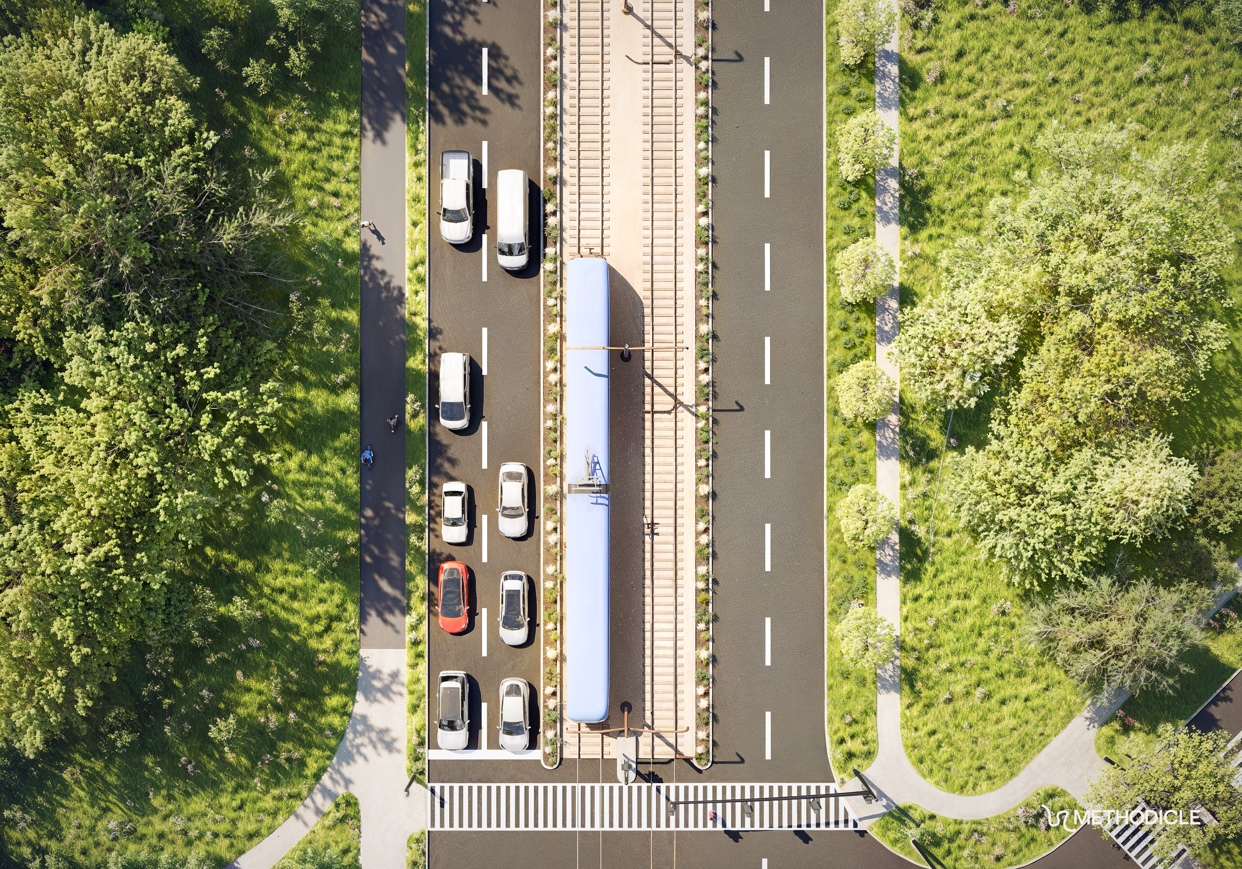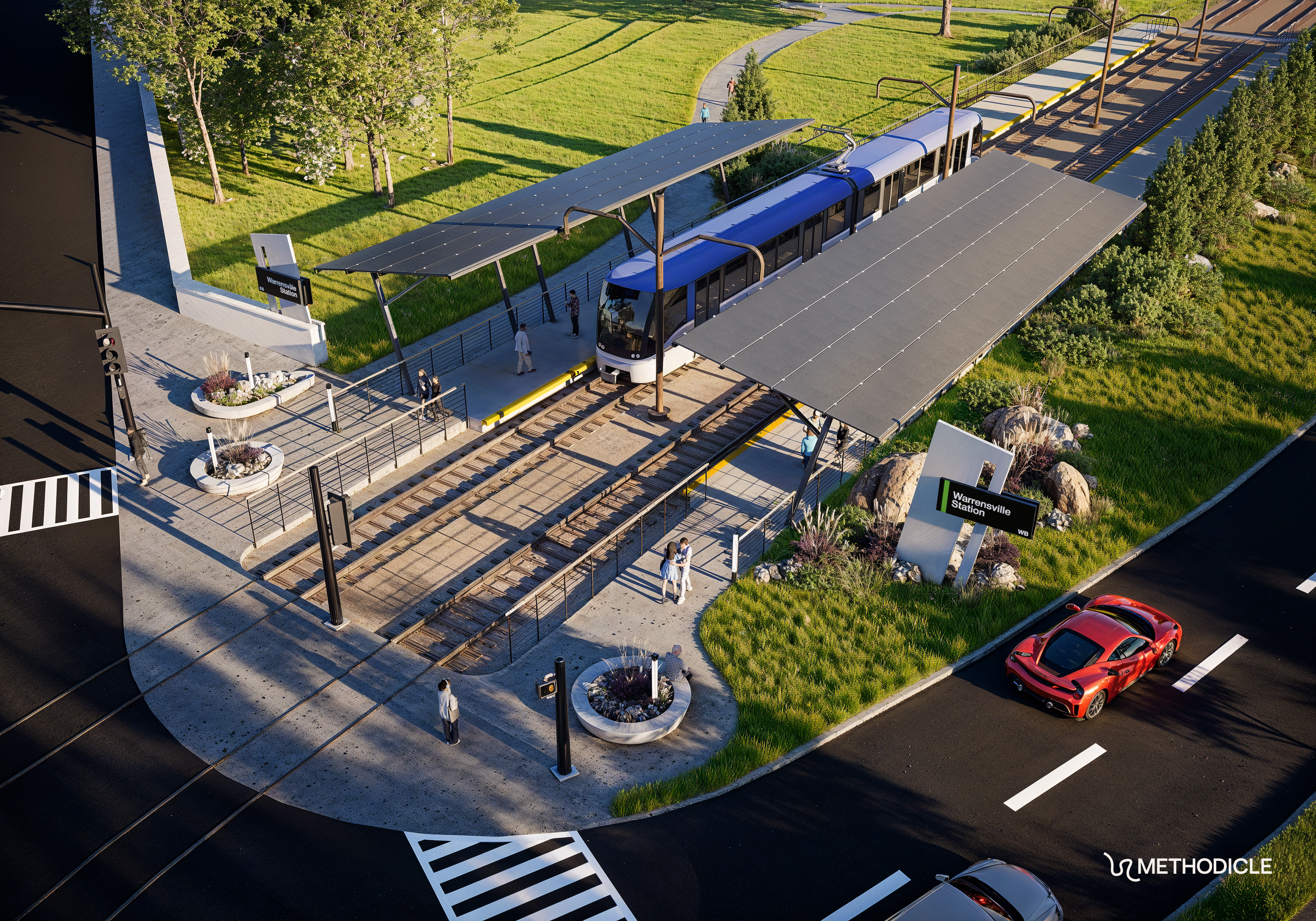▷ Dedicated rail right of way, multi-use path, and landscaping improvements.