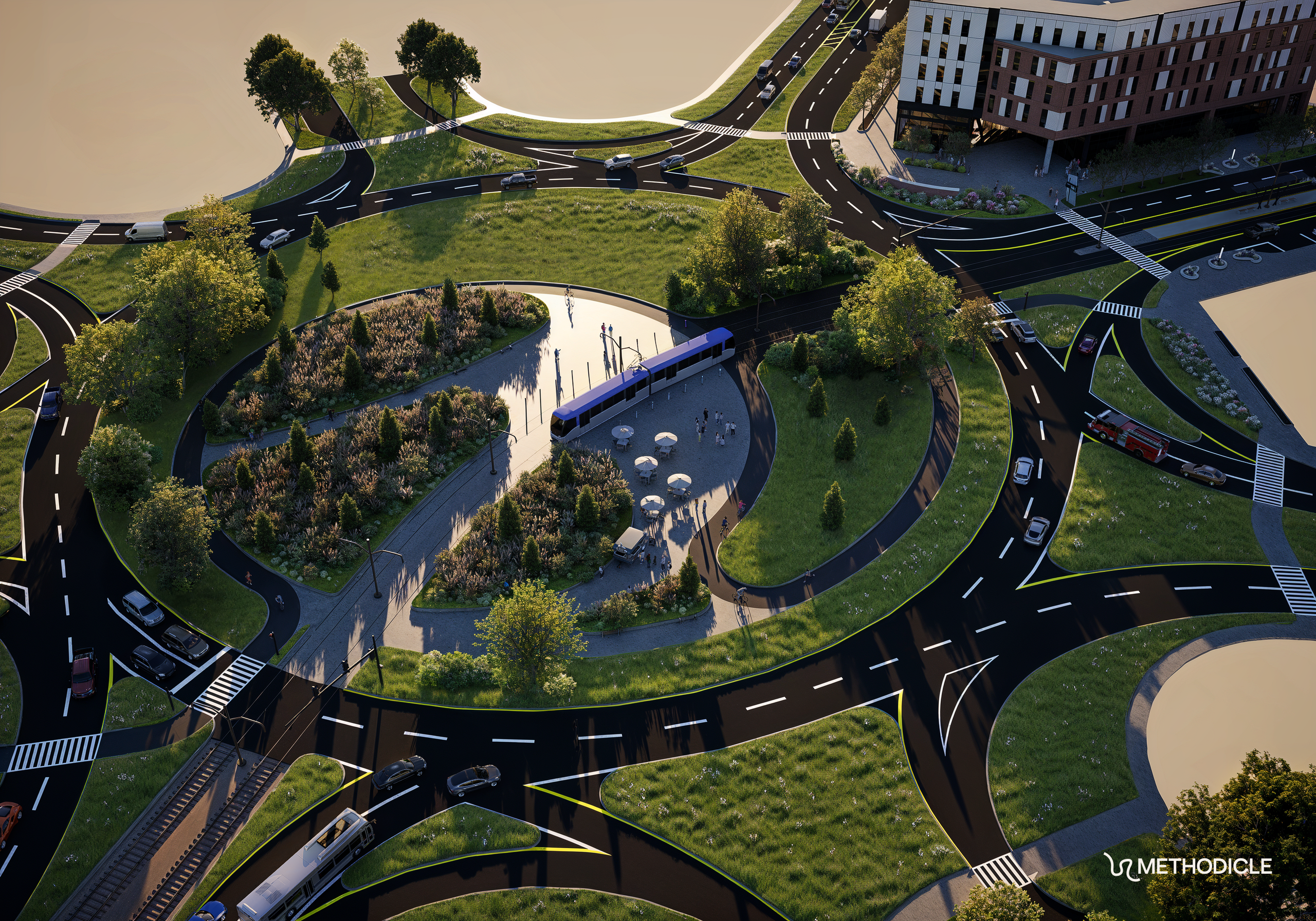 Due to the unique size of Warrensville Circle, redesigning it would eliminate the existing thru-lanes and create a true roundabout. Roundabouts are proven to simultaneously decrease travel times and increase pedestrian safety. Additional changes would include a new public plaza inside of the circle for community events, green space and dedicated rail/shared-use-path crossings.