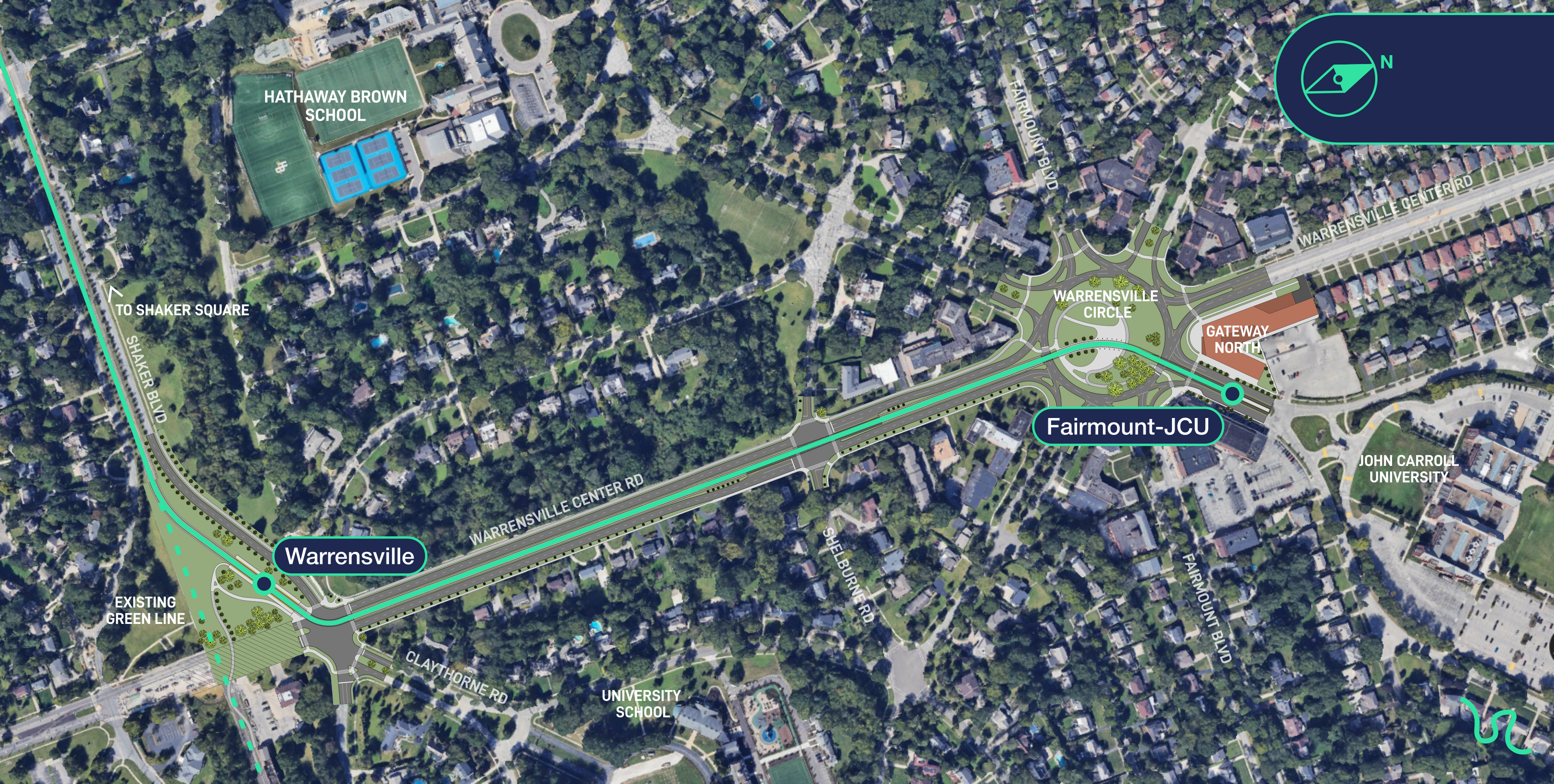This transit concept suggests rerouting the green line at a new Warrensville Station on Shaker Blvd. The extension follows Warrensville Center Rd north, travels through the middle of a redesigned traffic circle at Fairmount Blvd, and terminates adjacent to the future Gateway North redevelopment – the entrance to John Carroll University.