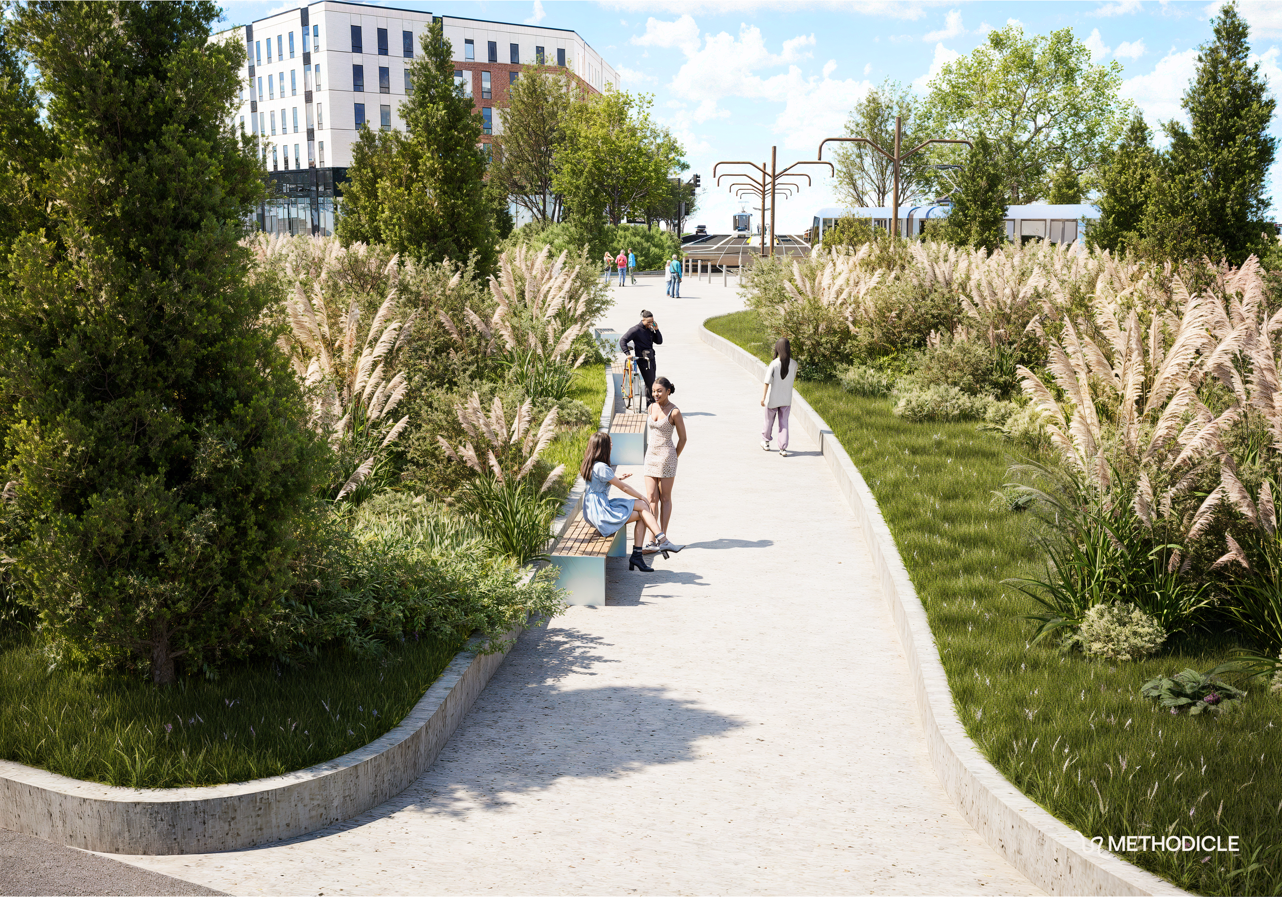 ▷ Dedicated rail right of way, multi-use path, and landscaping improvements.