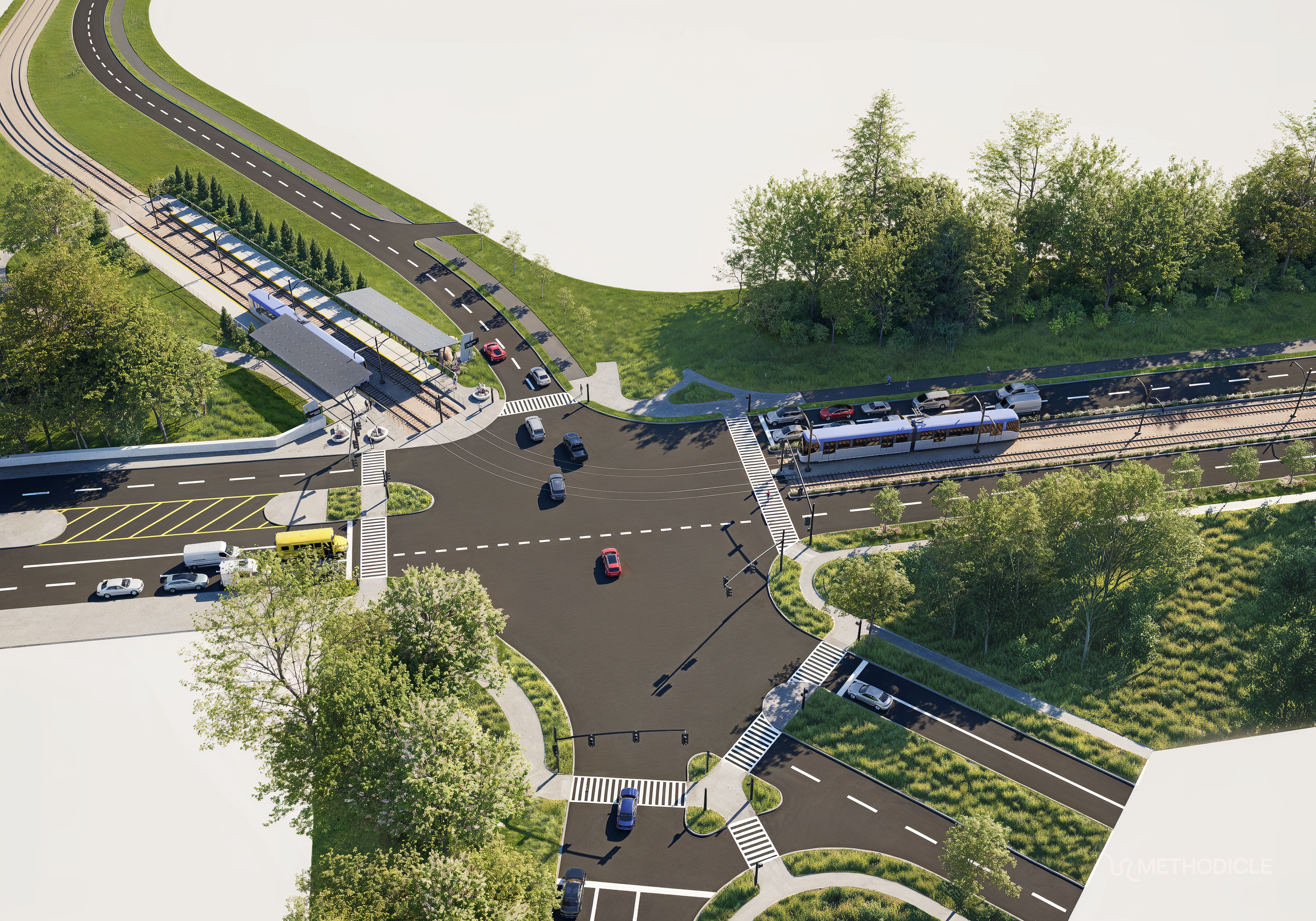 This transit concept suggests rerouting the green line at a new Warrensville Station on Shaker Blvd. The extension follows Warrensville Center Rd north, travels through the middle of a redesigned traffic circle at Fairmount Blvd, and terminates adjacent to the future Gateway North redevelopment – the entrance to John Carroll University.