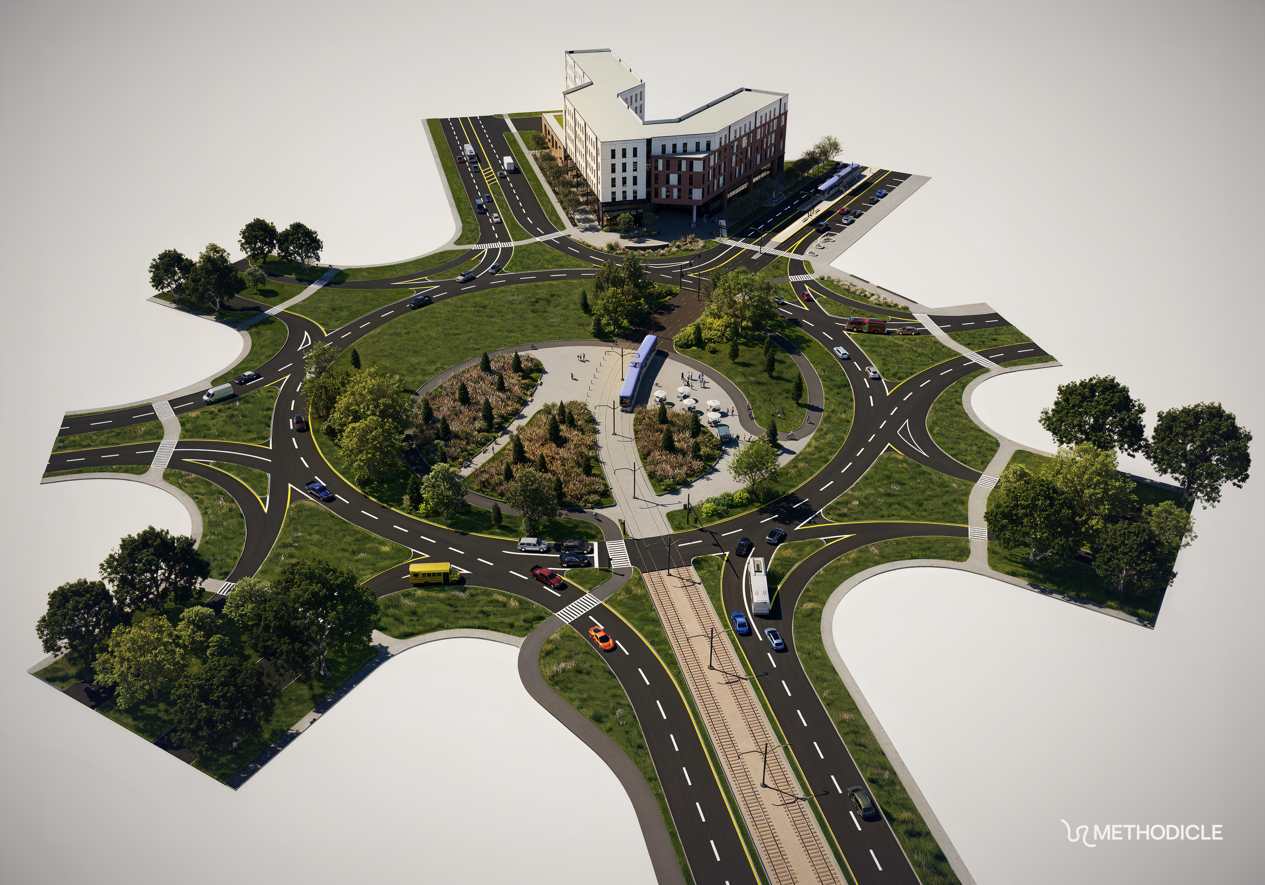 Due to the unique size of Warrensville Circle, redesigning it would eliminate the existing thru-lanes and create a true roundabout. Roundabouts are proven to simultaneously decrease travel times and increase pedestrian safety. Additional changes would include a new public plaza inside of the circle for community events, green space and dedicated rail/shared-use-path crossings.